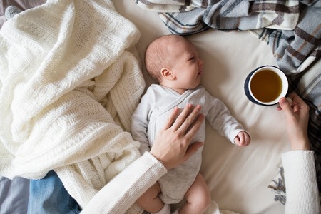 Unrecognizable mother with newborn baby son lying on bed