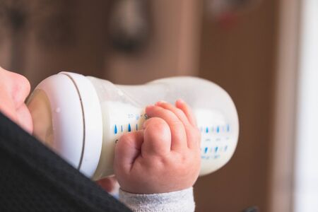 Close up portrait of baby eating from a bottle. Side view. Concept of infant feeding and weaning.