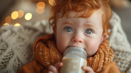 Close up portrait of cute redhead baby boy drinking milk from bottle
