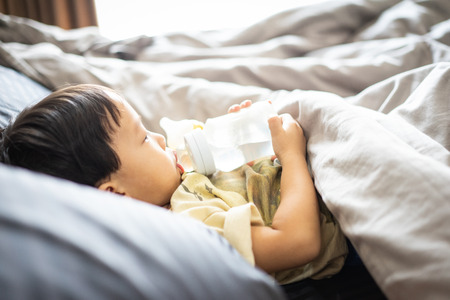 A boy is sucking a bottle of milk in the morning while watching TV in the bed in the bedroom.