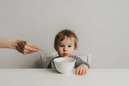 Mother feeds child in simple kitchen during morning light