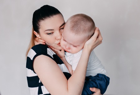 Mother holding baby in her arms in a white bedroom.Love of family concept