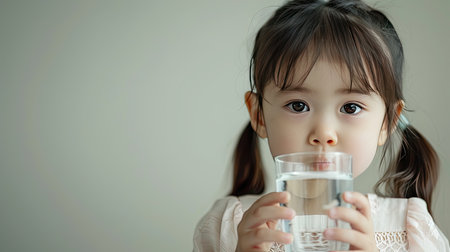 A young girl gracefully drinks water from a glass, her innocence captured in a simple act of hydration.
