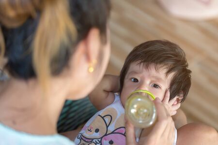Mother feeding baby from milk bottle on bed at hoe