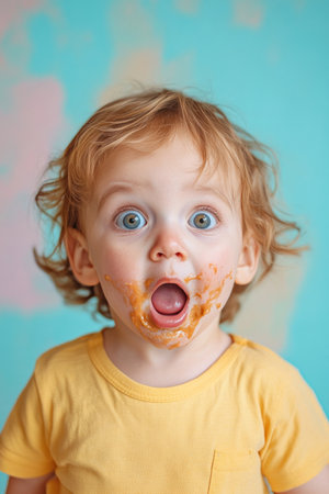 Close-up of a surprised baby with a dirty face, enjoying a messy meal of peanut butter