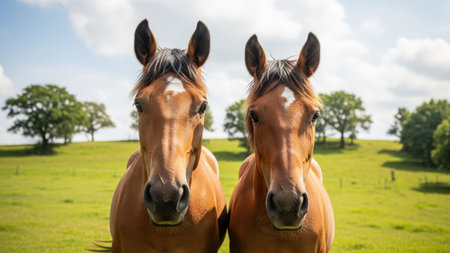 This captivating image features two horses grazing closely together in a lush green field, showcasing their gentle nature and expressive eyes.