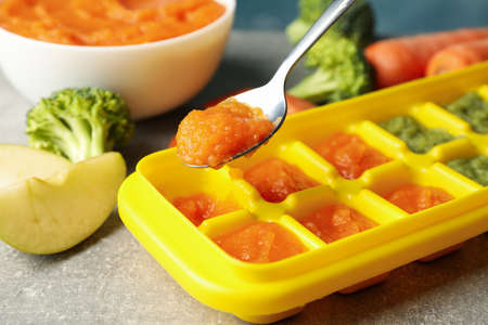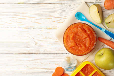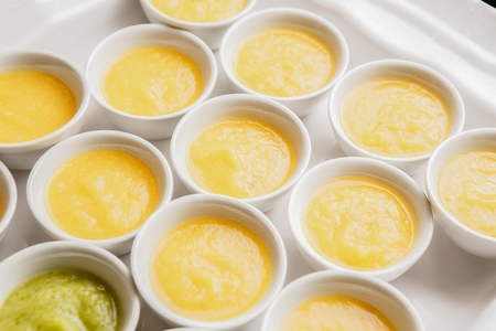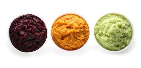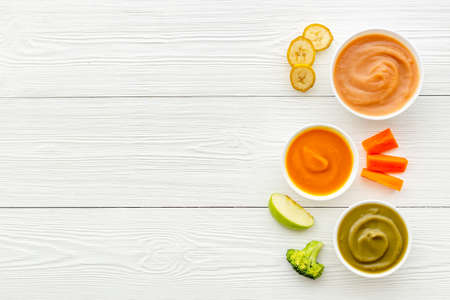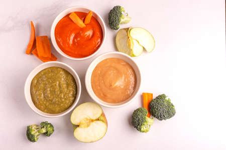 Variety of homemade baby vegetable and fruit puree, white marble background copy space top view