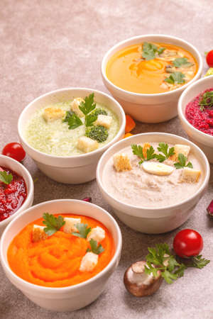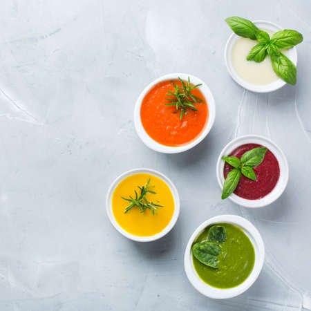 Variety of colorful tasty vegetables cream soups and fresh ingredients for soups. Healthy food concept or vegetarian food. Gray marble background