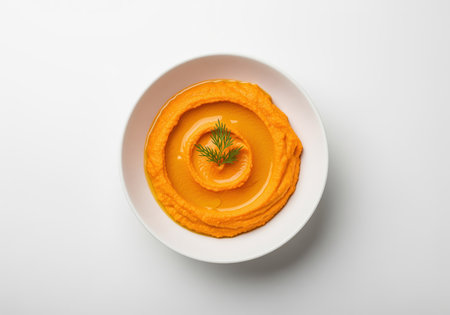 Vibrant orange carrot hummus, perfectly smooth, garnished with a golden olive oil swirl and a fresh dill sprig in a white bowl. healthy, vegan, and delicious appetizer or dip.