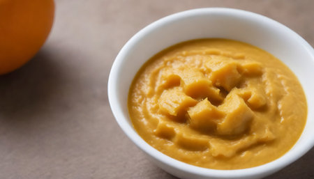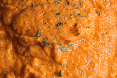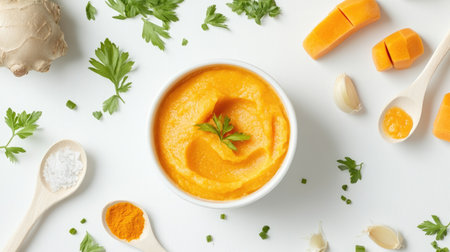 Delve into the vibrant world of cooking with this creamy butternut squash puree. Fresh herbs and spices contribute to its rich color and flavor, perfect for versatile meal preparations.