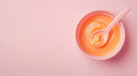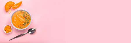 Bowl with delicious pumpkin cream soup on pink background with space for text