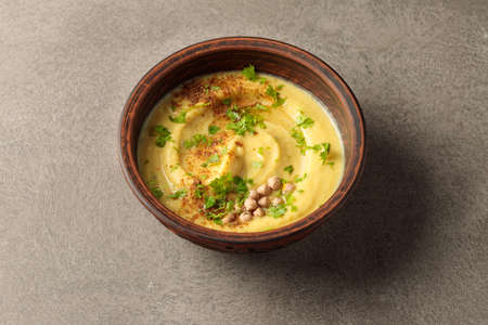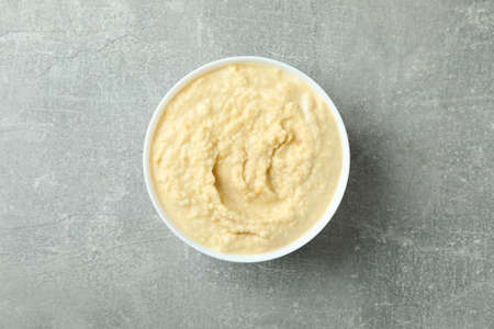 Pasta made from chickpeas, peas or baked vegetables. Hummus in a bowl on a gray background, close-up