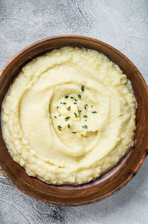 Boiled potato puree, Mashed potatoes in a wooden plate. White background. Top view