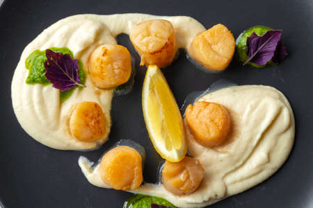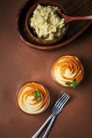 Close up mash potato from Tomahawk steak with mash potato, baked spinach cheese and gravy sauce. Served with red wine.