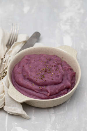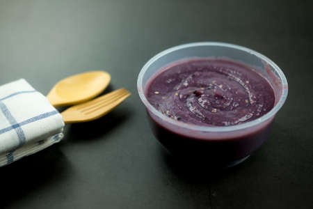 Tasty homemade puree purple potato cream soup put on a black background next to a kitchen cloth and a wooden fork and spoon.