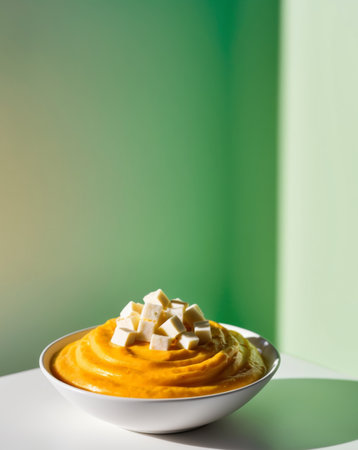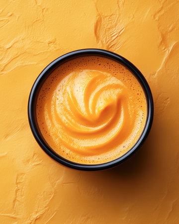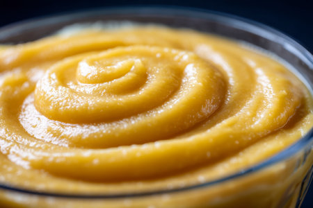 A velvety, sun-kissed pumpkin mash elegantly swirls within a clear glass bowl, evoking cozy autumn flavors and inspiring seasonal culinary creations.