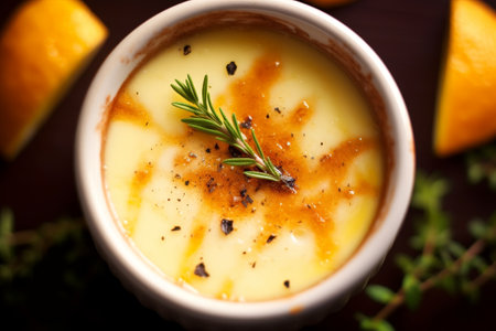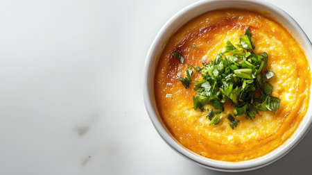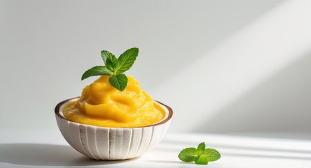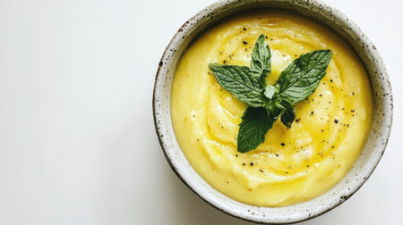 A delicious creamy yellow soup topped with fresh mint leaves adds a pop of color to your culinary visuals. Ideal for recipes, food blogs, or menu designs.