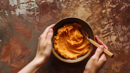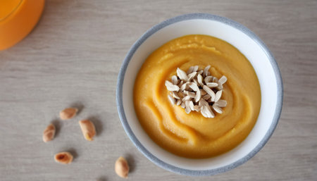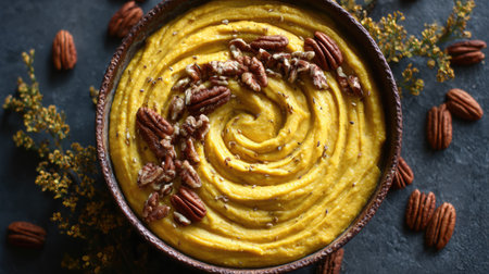 This vibrant pumpkin puree features creamy texture, garnished with pecans, served in a rustic bowl, perfect for autumn meals or gatherings.