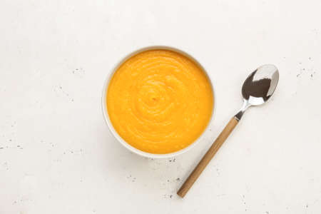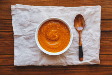 Hot pumpkin soup in a bowl on wooden background, top view, flat lay style. Homemade autumn food. Popular Thanksgiving dish.
