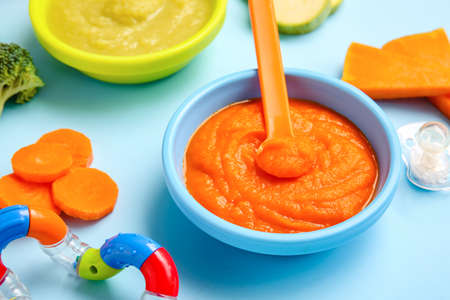 Set of bowls with baby food with fruits and vegetables. Kid feeding, top view