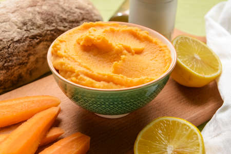 Bright tasty pureed carrot soup in clay bowl on woden cutting board. Healthy food concept. Gray marble background. Horizontal view. Copy space