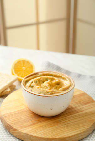 Bowl with tasty carrot hummus and lemon on table, closeup