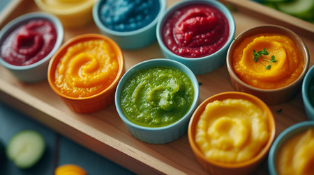 Healthy snacks - four colorful mousses from yellow paprika, carrot, red beet, spinach