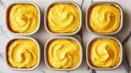 This image showcases creamy yellow buttercream frosting in metallic containers, perfect for enhancing baked goods and desserts with a smooth and vibrant finish.