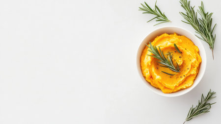 A bowl of mashed sweet potatoes topped with sprigs of rosemary, arranged on a clean white surface with ample text space.