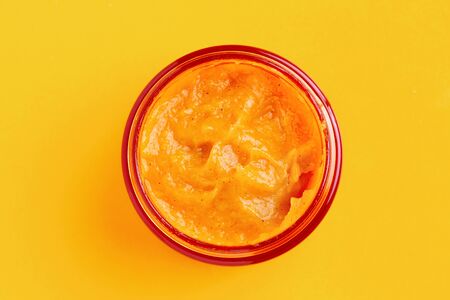 Pumpkin face mask in a glass jar with flower petal. DIY cosmetics and spa. Top view, Copy space. Concept Flat