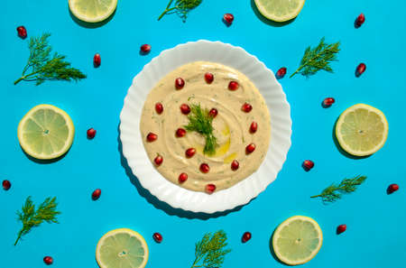 Famous traditional Arabic, Eastern and Israel appetizer - Tahini dip with pomegranate on blue background. Top view. Tahina sauce with its ingredients. Pattern made of fresh dill, lemon and pomegranate