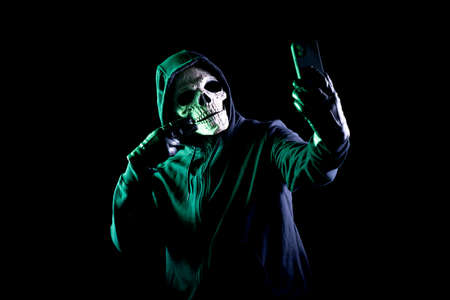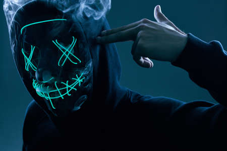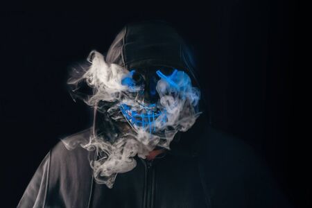 Man with lighting neon glow mask in hood and vape vapour from mask on black background. Halloween and horror concept.