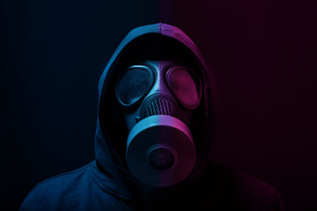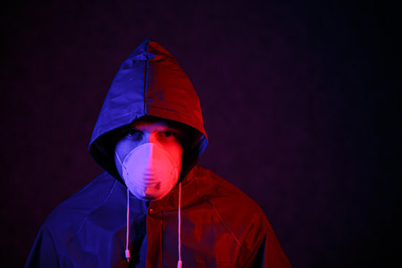 Portrait of a young woman in a hood, wearing a protective medical mask, illuminated by red and blue light, isolated on black background