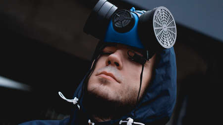 Environmental disaster. Post-apocalyptic survivor in gas mask on a dark background. Dramatic portrait of a man wearing a gas mask. Means for radiation protection. Selective focus