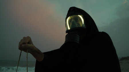 Man With Gas Mask In Radiation Contaminated Nuclear Site At Night