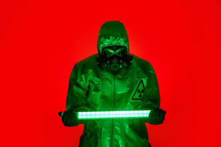Coronavirus. A man in a mask and chemical protection suit in red and blue light. Fight against the virus