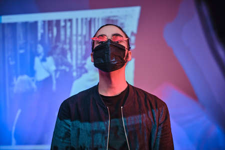 Young caucasian man wearing medical mask, sunglasses and black clothes looking calm. Isolated in a bright studio on a projected background