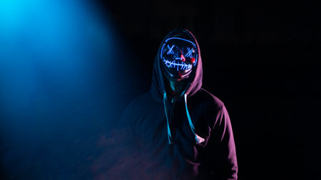 Portrait of an anonymous man in a black hoodie hiding his face behind a scary neon mask. Studio shot.