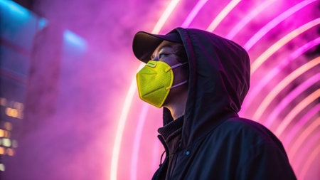 Cyberpunk hacker with neon mask standing in rain. AI-generated.