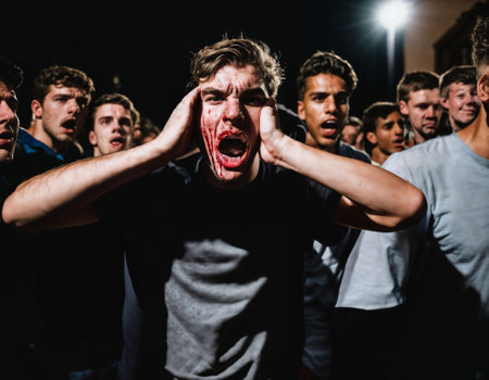 photo group of rage angry teenage college boy fighting the other with wound on face, generative AI