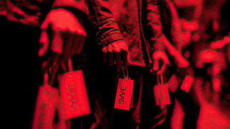 This striking image captures hands holding tags in a protest atmosphere, bathed in dramatic red light, emphasizing emotion and social messages.