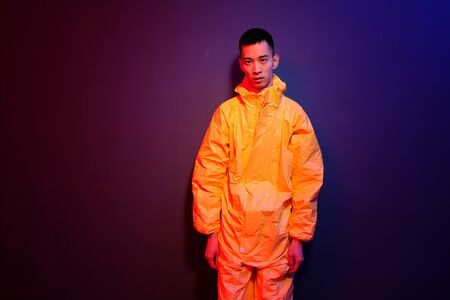 Asian man in a yellow suit of chemical protection on a colored trendy background. Fashion shooting in Asian style, neon lights and fashionable clothes, professional model. Coronavirus Protection.