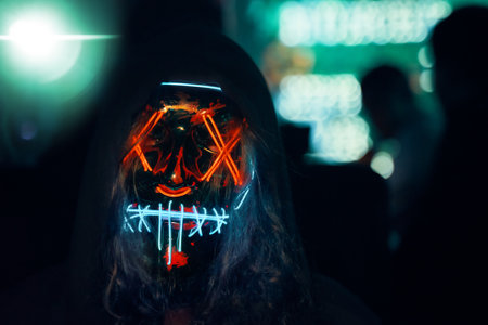 Human in hood with long disheveled hair in a lighting neon glowing mask. Anonymous man is a cyber criminal. Halloween dress-up party in night club. All Saints Night.