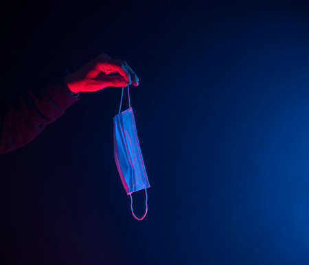Portrait of a young woman in a hood who takes off a medical protective mask, in red and blue light, isolated on a black background