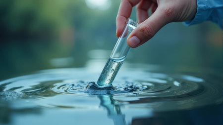A hand delicately lifts a test tube filled with shimmering blue particles from the water's surface. Soft ripples reflect early morning light, creating a serene and enchanting atmosphere.