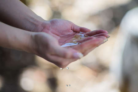 Hands sachibalaya clean water from the mountain stream bubbling