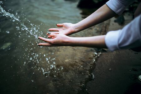 The Girl's hand surging water and drops and splashes fly. Touching the river with the palm of your hand while walking along the embankment