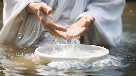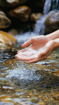 Hands gently holding crystal-clear water in a sunlit stream, reflecting golden light and symbolizing purity, nature.