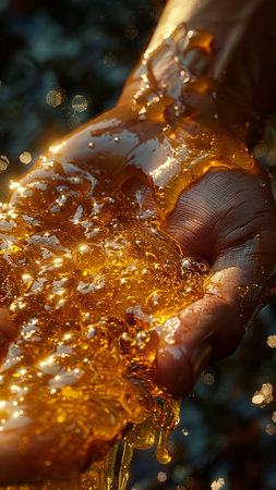 Honey dripping from a beekeeper's hand, close-up