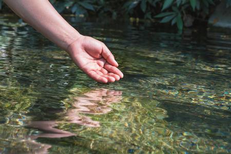 Human hand is touching water on the river,water crisis